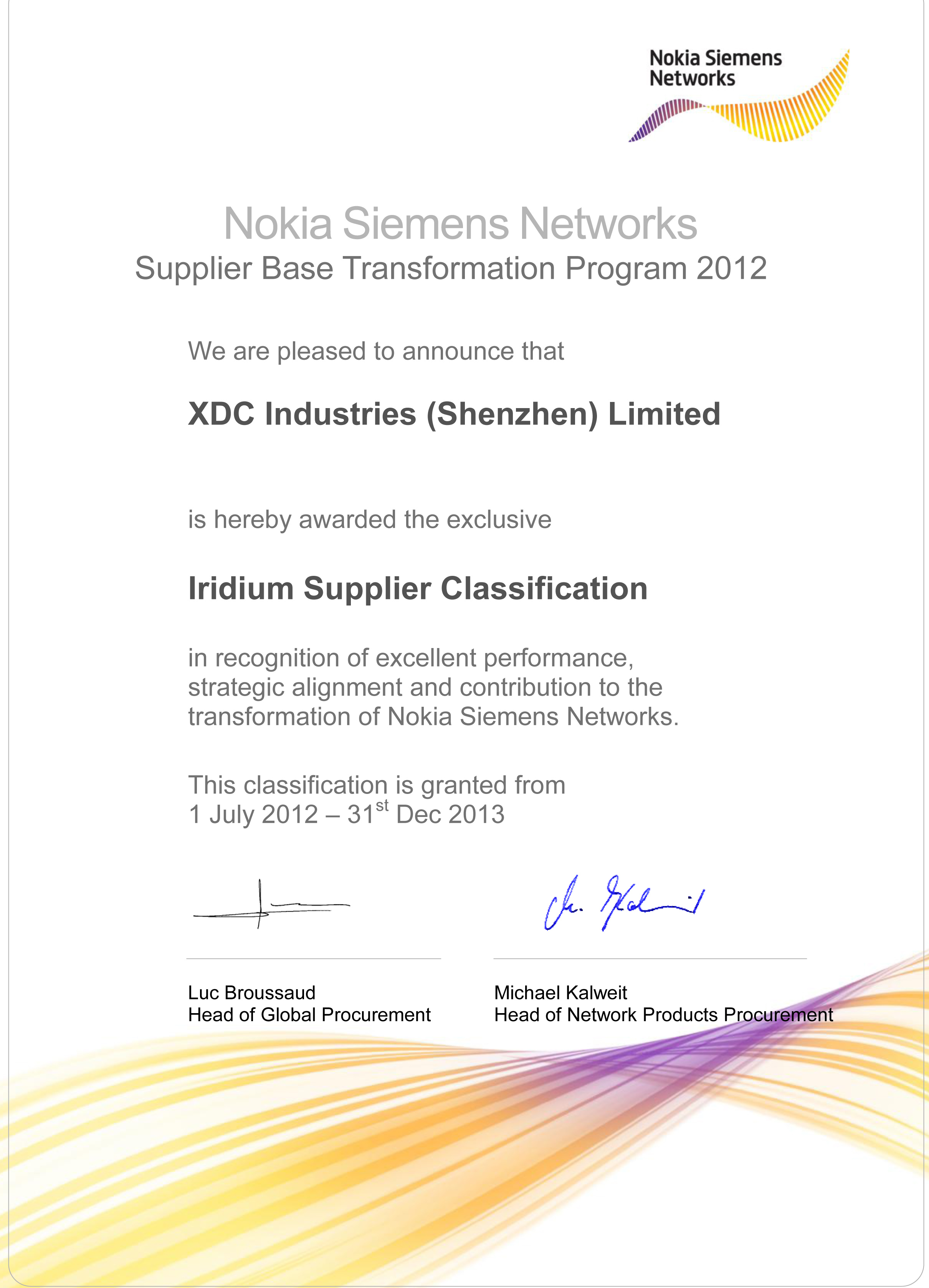 ________诺基亚西门子铱金级供应商